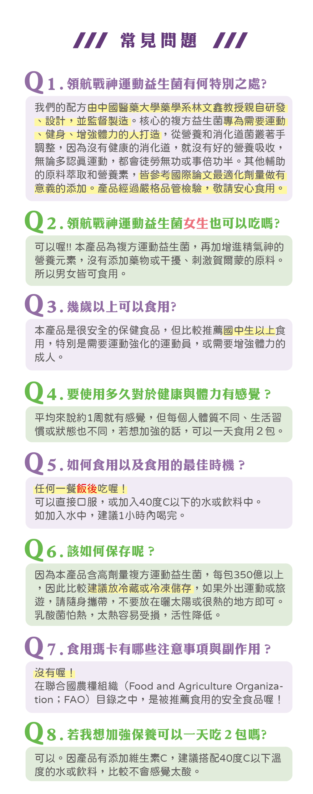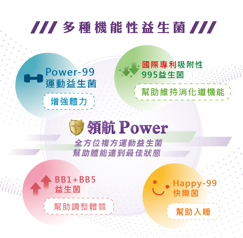 添加各種機能性益生菌,包括:Power-99運動益生菌,可以增強體力,搭配國際專利吸附性995益生菌可幫助維持消化道機能,以及BB1+BB5益生菌可幫助調整體質,更添加Happy-99快樂菌可幫助入睡,複方益生菌幫助您的體能達到最佳狀態。