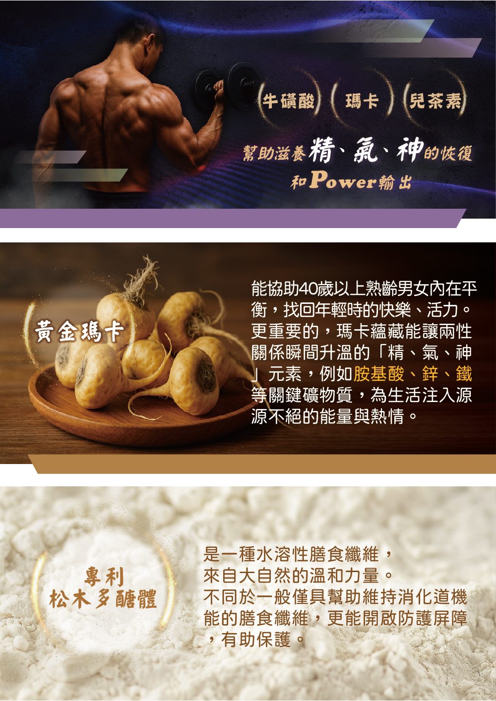 添加牛磺酸、瑪卡、兒茶素,幫助滋養精、氣、神的恢復,和Power輸出。